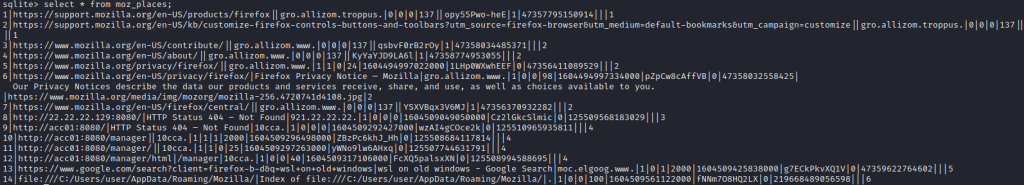 We can also run PRAGMA table_info(moz_places) to get column names. The most interesting is the http://acc01:8080/manager that gets visited. This is properly a reference to a local Apache Tomcat installation that uses /manager and /manager/html for the management dashboard. At the end, they also access the Roaming/Mozilla folder through the browser, which is the folder we have.
